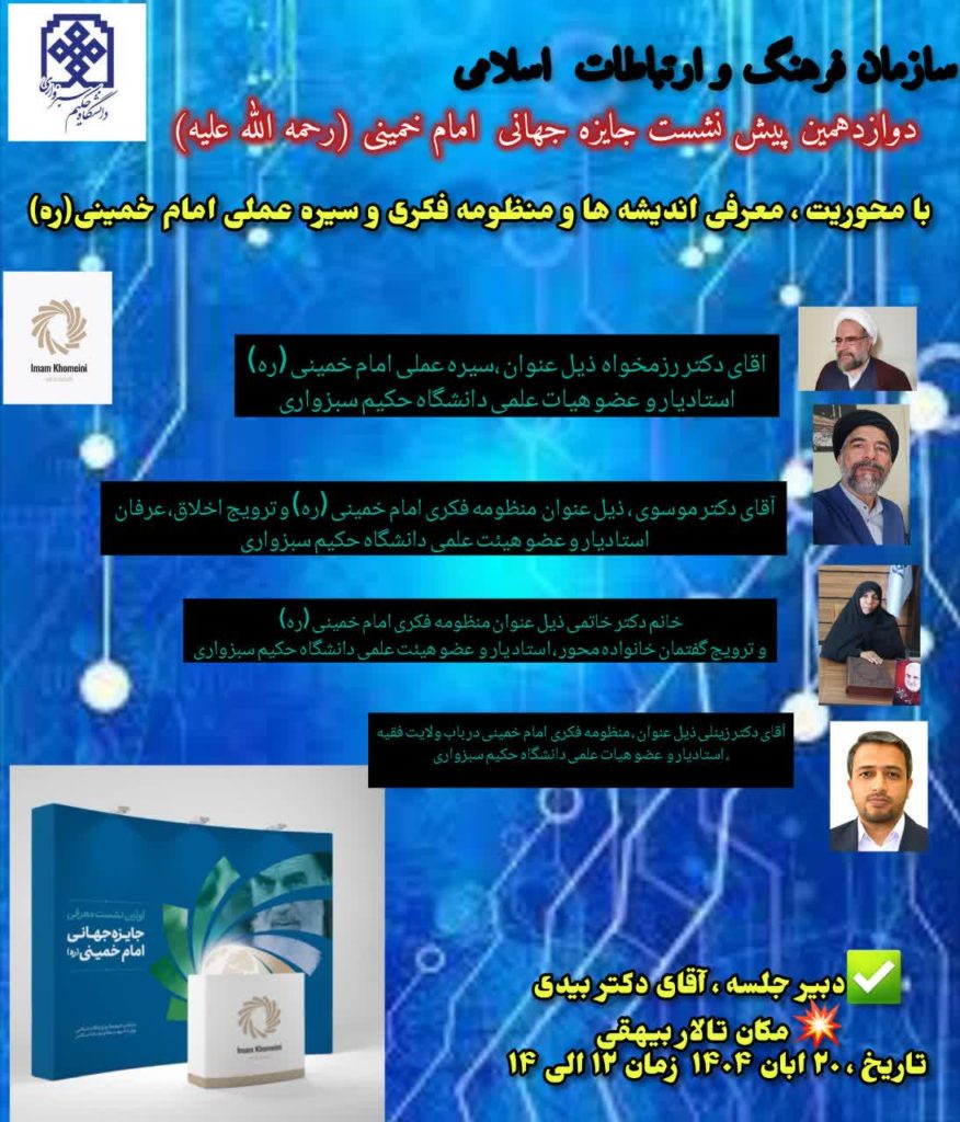 دوازدهمین پیش نشست جایزه جهانی امام خمینی (رحمه الله علیه) با محوریت “معرفی اندیشه ها و منظومه فکری و سیره عملی امام خمینی با حضور اساتید و دانشجویان در تالار همایش های بین المللی بیهقی دانشگاه حکیم سبزواری برگزار گردید .