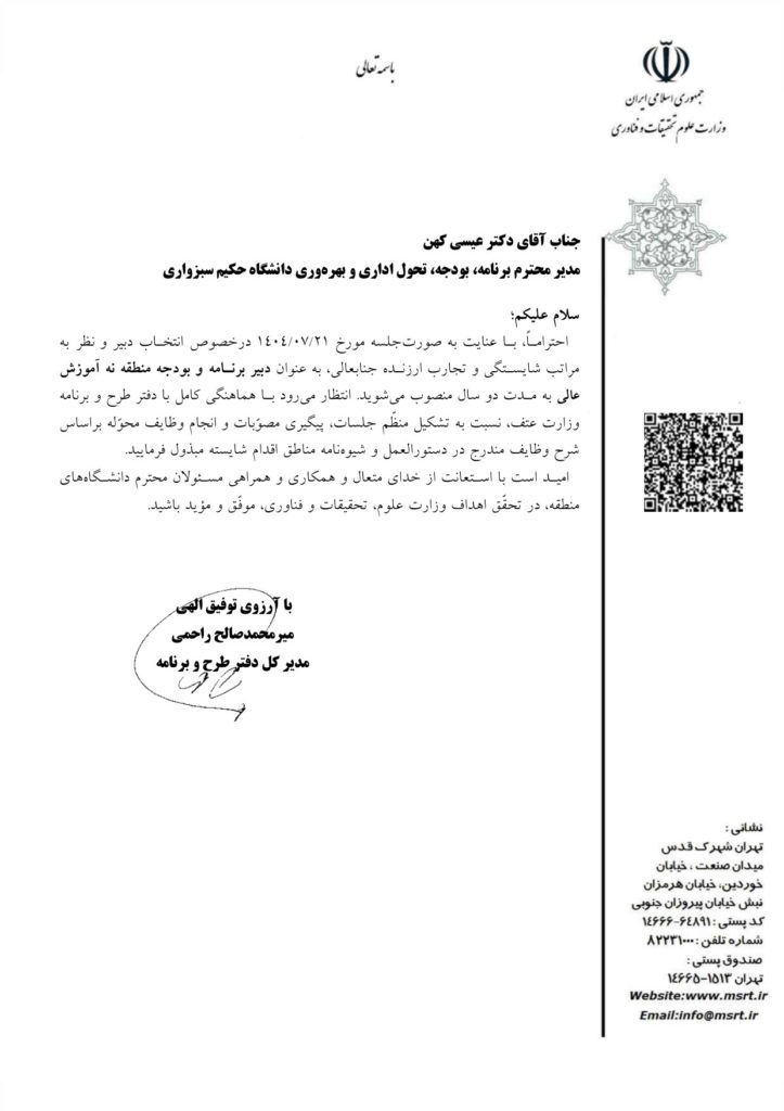 طی حکمی از سوی دکتر میر محمدصالح راحمی مدیر کل دفتر برنامه، بودجه، تشکیلات و تحول اداری وزارت علوم، دکتر عیسی کهن مدیر برنامه، بودجه، تحول اداری و بهره وری دانشگاه حکیم سبزواری به عنوان دبیر برنامه و بودجه منطقه نه آموزش عالی منصوب شد.