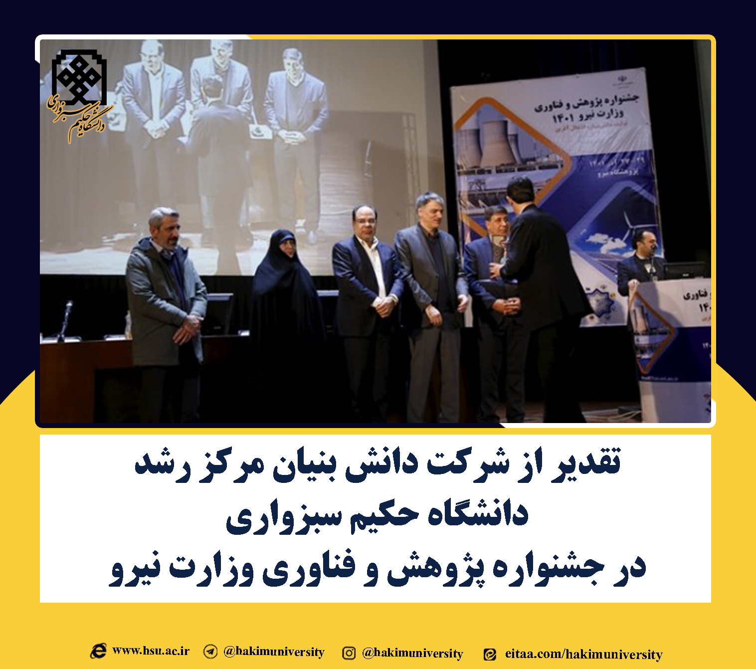 ه گزارش روابط عمومی دانشگاه، در جشنواره پژوهش و فناوری وزارت نیرو که با حضور شرکت های مادر تخصصی، شرکت های زیر مجموعه و شرکت های دانش بنیان فعال در صنعت آب و برق ۲۹ آذرماه در محل پژوهشگاه نیرو برگزار شد، از شرکت دانش بنیان پردازش سیر آفاق مستقر در مرکز رشد دانشگاه حکیم سبزواری با عنوان پروژه اندازه گیری بار رسوبات معلق در رودخانه مبتنی بر نورسنجی با حضور مهندس “مریم کارگر نجفی” معاون تحقیقات و منابع انسانی وزارت نیرو تقدیر به عمل آمد.