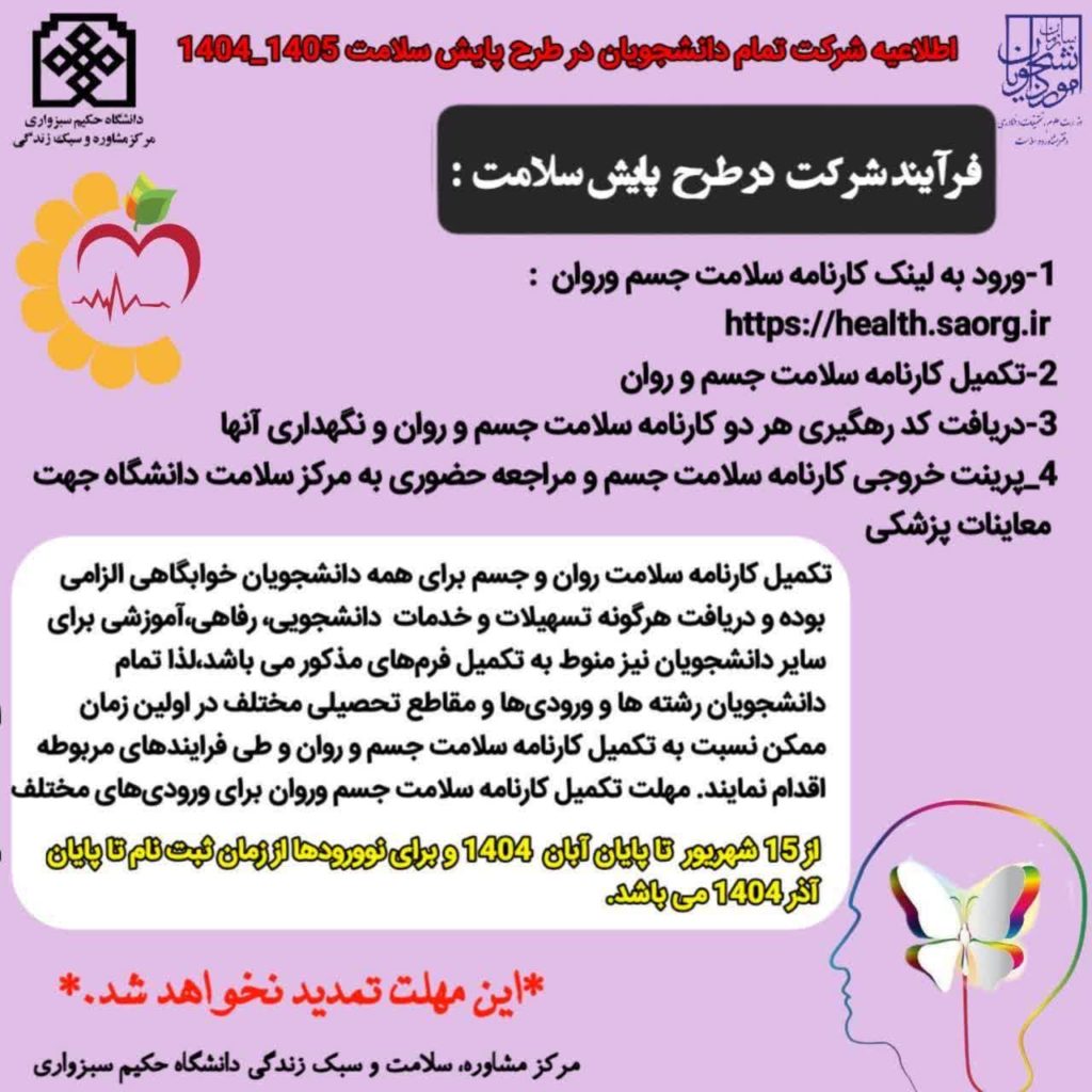 🗓مهلت شرکت در طرح پایش سلامت جسم وروان برای دانشجویان رشته ها و ورودیهای مختلف تا ۳۰ آبان ۱۴۰۴ و برای دانشجویان نوورود از زمان ثبت نام تا ۳۰ آذر می باشد.