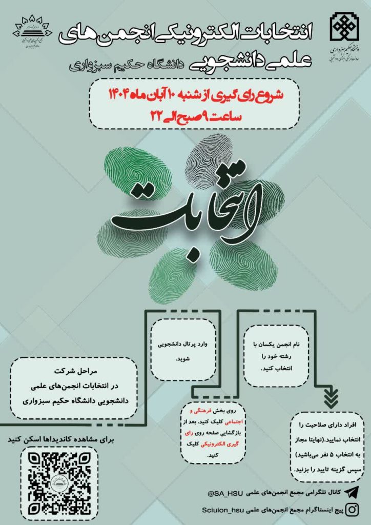 به اطلاع کلیهی دانشجویان گرامی میرسد که انتخابات انجمنهای علمی در روز شنبه، ۱۰ آبانماه برگزار خواهد شد.