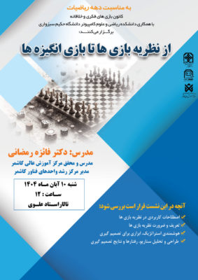 در نشست علمی که به مناسبت دهه ریاضیات به همت کانون بازی و خلاقیت و همکاری دانشکده ریاضی و علوم کامپیوتر دانشگاه حکیم سبزواری با ارائه دکتر فائزه رمضانی مدیر مرکز رشد واحدهای فناور کاشمر برگزار شد، مفاهیم بنیادی نظریه بازیها و نقش آن در علوم کامپیوتر و هوش مصنوعی مورد بحث قرار گرفت.