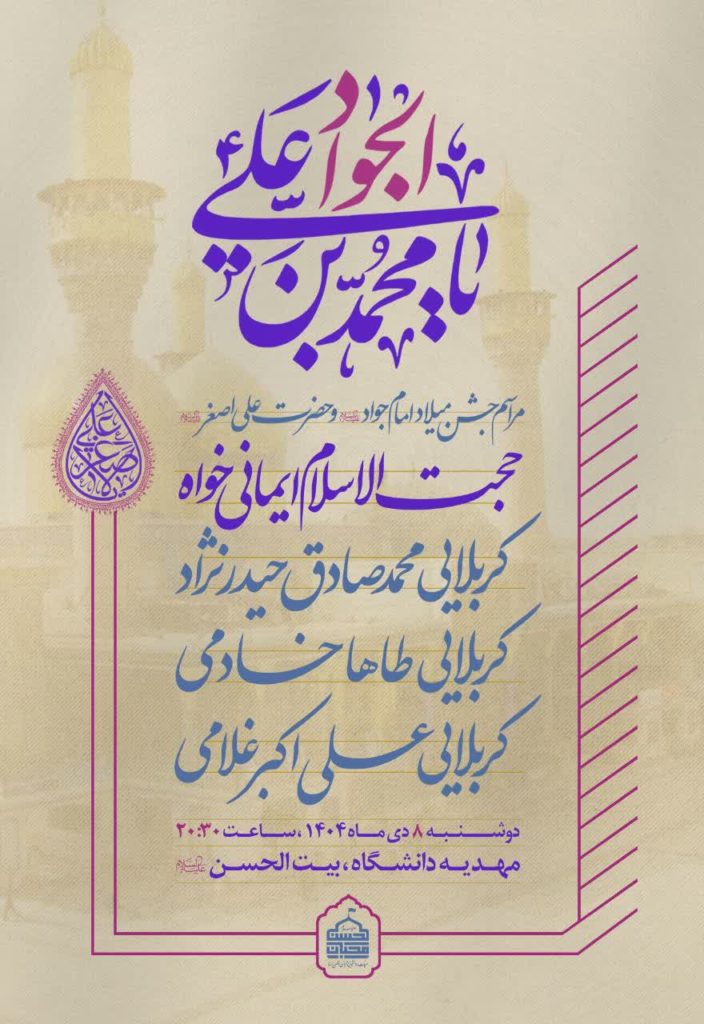 هیئت دانشجویی محبان الحسن علیه السلام در کرم خانه حق، سفره به نام حسن است ... مسابقه شعر و مدح به مناسبت ایام ولادت باسعادت امیرالمؤمنین امام علی (ع) دی ۱۶, ۱۴۰۴ ادامه مطلب » مراســــــم ولادت امام جواد(ع) وحضرت علی اصغر(ع) دی ۹, ۱۴۰۴ ادامه مطلب » گزارش تصویری مراسم مناجات خوانی شب لیله الرغائب وعزاداری شهادت امام هادی علیه السلام دی ۶, ۱۴۰۴ ادامه مطلب » مراسم مناجات خوانی شب لیله الرغائب وعزاداری شهادت امام هادی علیه السلام دی ۶, ۱۴۰۴ ادامه مطلب » جشن دخترانهی ولادت حضرت زهرا «س» دی ۱, ۱۴۰۴ ادامه مطلب » گزارش تصویری مراسم مناجات هفتگی قرائت دعـای پرفیض کمیل پنجشنبه ۲۰ آذر ماه دی ۱, ۱۴۰۴ ادامه مطلب » مراسم مناجات هفتگی قرائت دعای پرفیض کمیل پنجشنبه ۲۰ آذر ماه دی ۱, ۱۴۰۴ ادامه مطلب » گزارش تصویری مراسم جلسه هفتگی به مناسبت ولادت حضرت زهرا(سلاماللهعلیها) دی ۱, ۱۴۰۴ ادامه مطلب » « قبلی برگه۱ برگه۲ برگه۳ برگه۴ برگه۵ بعدی »