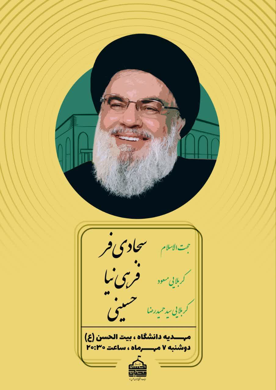 #اعلام_برنامه 🔻 مراســــــم سالگرد شهادت سیدحسن نصرالله و توسل به امام حسن مجتبی(ع) ▪️به کلام : حجت الاسلام #سجادی_فر ▪️با نوای : کربلایی مسعود #فرهی_نیا کربلایی سیدحمیدرضا #حسینی 📆 دوشنبه