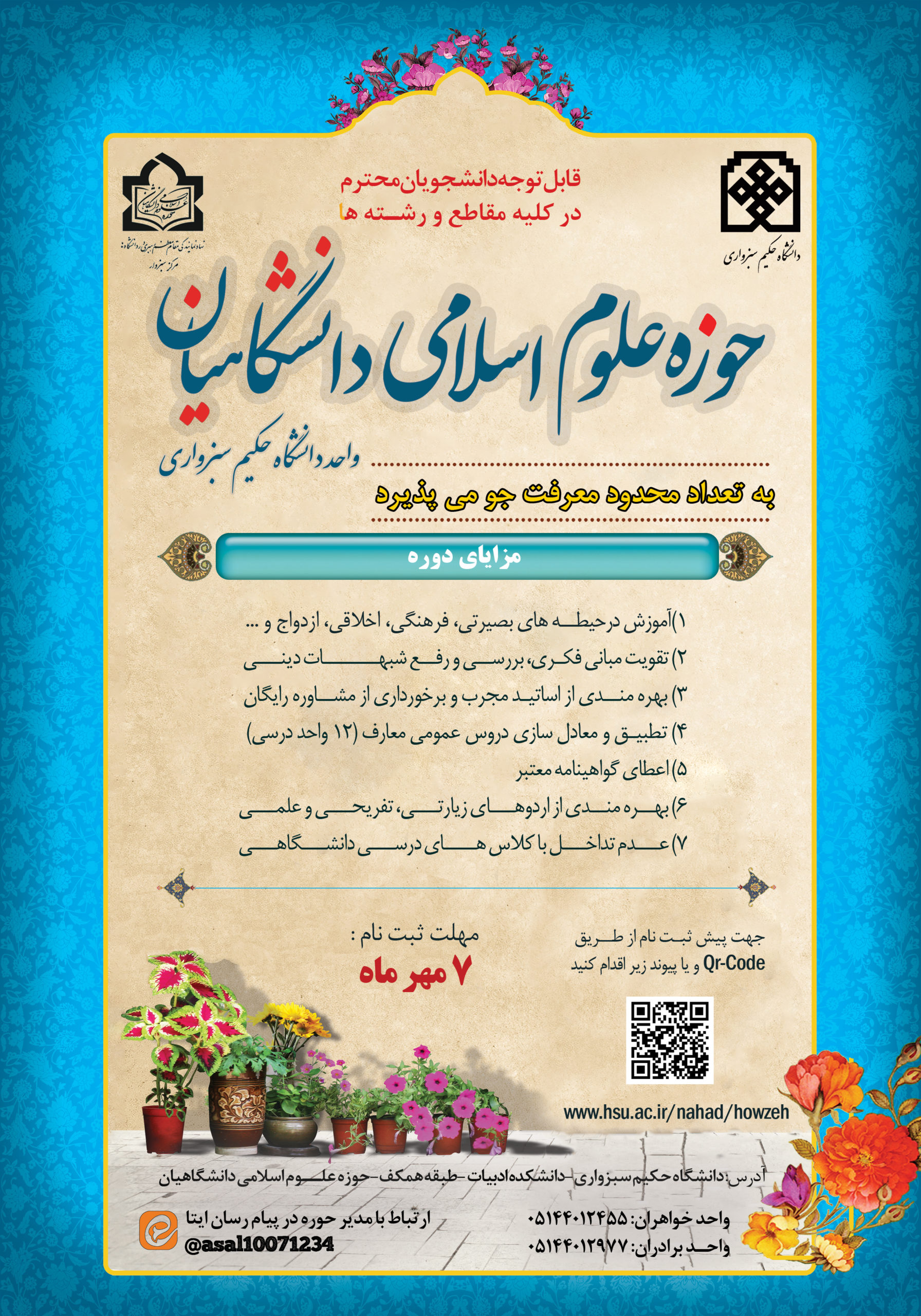 📣 آغاز ثبت نام ترم جدید حوزه علوم اسلامی دانشگاه حکیم سبزواری 👈دوره های آموزشی در حیطه های مختلف (بصیرتی، فرهنگی، اخلاق، ازدواج و…) 👈اردوهای زیارتی تفریحی 👈اعطای گواهینامه 👈تطبیق