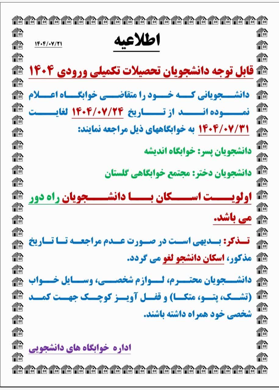 اطلاعیه اداره خوابگاه ها: قابل توجه دانشجویان تحصیلات تکمیلی ورودی ۱۴۰۴