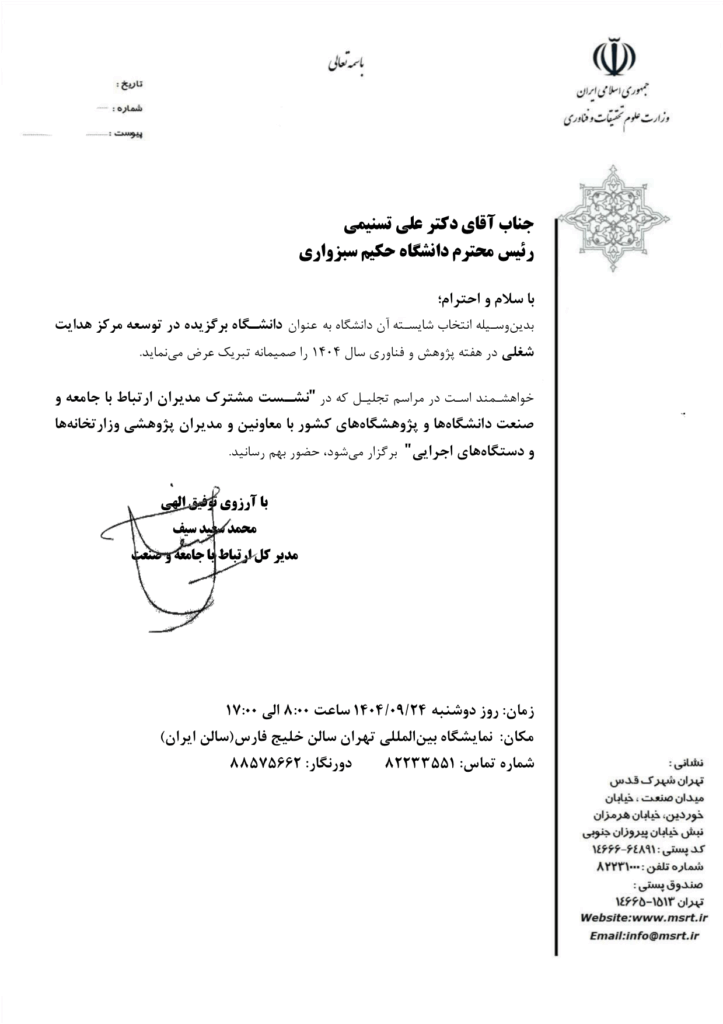 بر اساس نامه رسمی وزارت علوم به امضای دکتر محمد سعید سیف، مدیرکل ارتباط با جامعه و صنعت، این موفقیت ملی به دکتر علی تسنیمی، رئیس دانشگاه حکیم سبزواری تبریک گفته شده و اعلام شده است که از دانشگاه در نشست مدیران ارتباط با جامعه و صنعت دانشگاهها و پژوهشگاههای کشور بهصورت رسمی تقدیر خواهد شد.