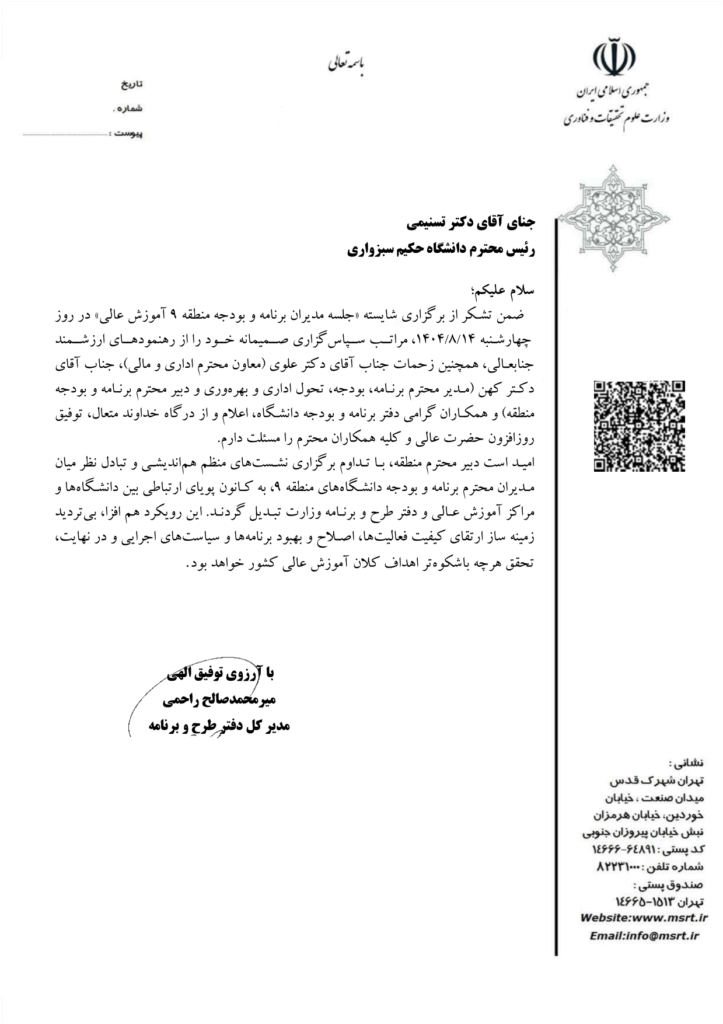 به گزارش روابط عمومی دانشگاه ، در این نامه که به امضای دکتر میرمحمد صالح راحمی، مدیرکل دفتر طرح و برنامه وزارت علوم رسیده است، ضمن تقدیر از دکتر تسنیمی رئیس دانشگاه حکیم سبزواری بهخاطر مدیریت و میزبانی مطلوب این نشست، از زحمات دکتر علوی معاون اداری و مالی، دکتر کهن دبیر منطقه ۹ و مدیر برنامه، بودجه، تحول اداری و بهرهوری دانشگاه و سایر همکاران دفتر برنامه و بودجه قدردانی شده است.