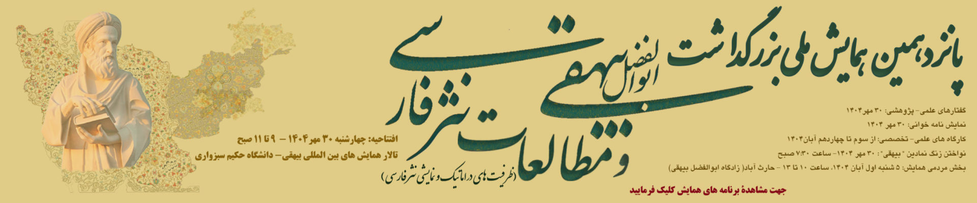 به مناسبت اول آبان: روز ملی بزرگداشت ابوالفضل بیهقی( پدر نثر فارسی) پانزدهمین همایش ملی بزرگداشت ابوالفضل بیهقی و مطالعات نثر فارسی ( ظرفیت های دراماتیک و نمایشی نثر فارسی) دانشگاه حکیم سبزواری - افتتاحیه: چهارشنبه ۳۰ مهر۱۴۰۴. ۹ تا...