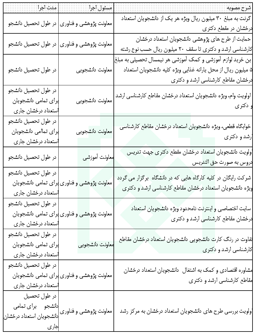 در جدول زير به اهم موارد تسهيلات دانشجويان استعداد درخشان اشاره شده است: