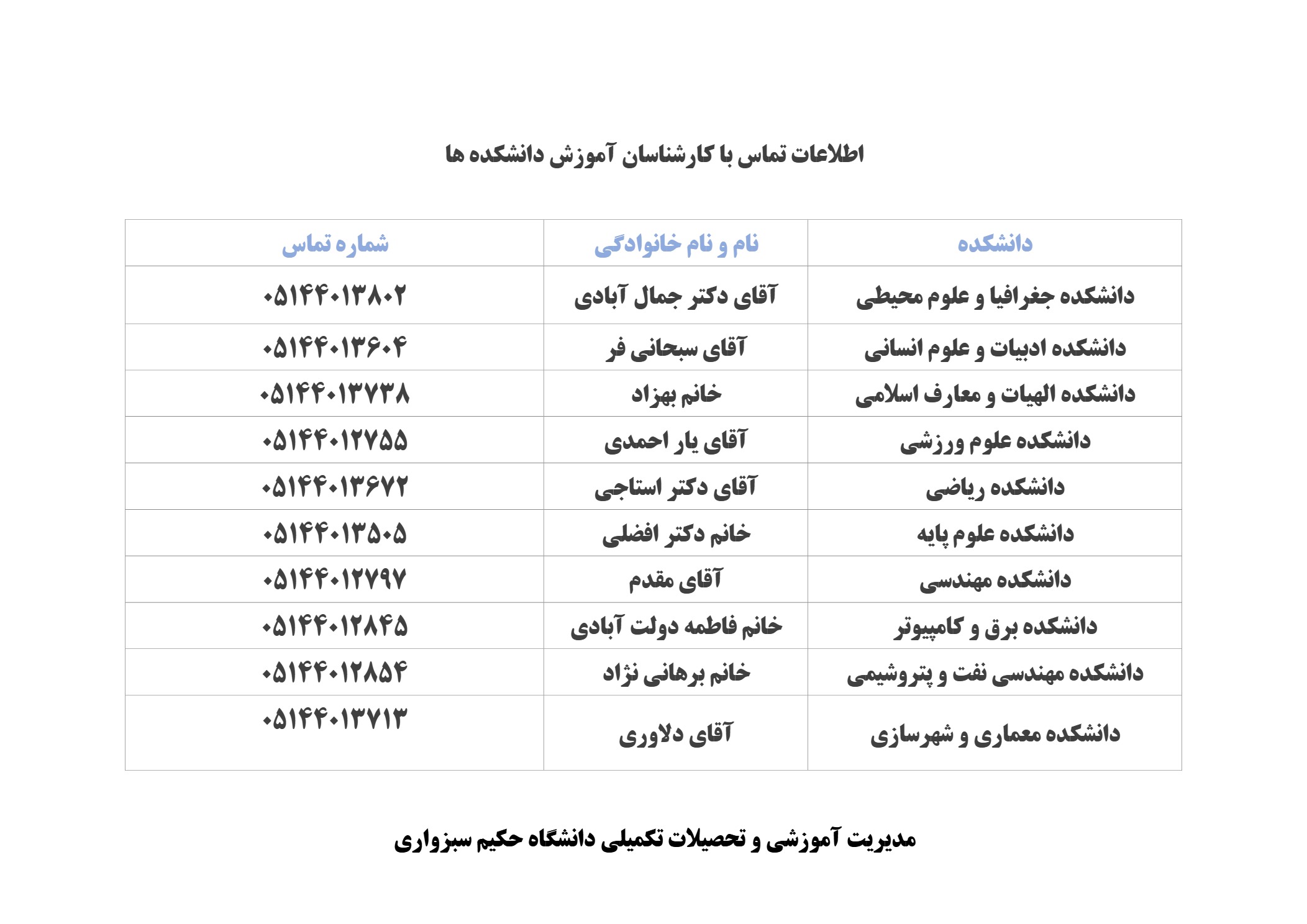 05144012635 (آقای فریدنیا) – 05144012622 (خانم مهرانفر) – 05144012627 (خانم سرایی)