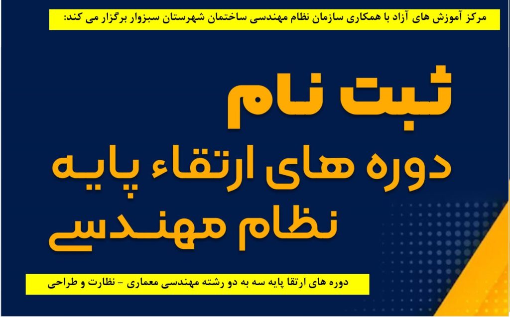 دوره های ارتقا پایه نظام مهندسی (ارتقا پایه سه به دو رشته مهندسی معماری )- نظارت و طراحی معماری پایدار و روش های صرفه جوئی انرژی در ساختمان(ارتقا پایه سه به دو رشته مهندسی معماری )- نظارت و طراحی-مهلت ثبت نام 10 آذرماه بکارگیری استاندارها، مقررات ملی، راهنماهای طراحی(ارتقا پایه سه به دو رشته مهندسی معماری )- نظارت و طراحی-مهلت ثبت نام 10 آذرماه مصالح و فناوریهای نوین در صنعت ساختمان (ارتقا پایه سه به دو رشته مهندسی معماری )- نظارت و طراحی-مهلت ثبت نام 10 آذرماه