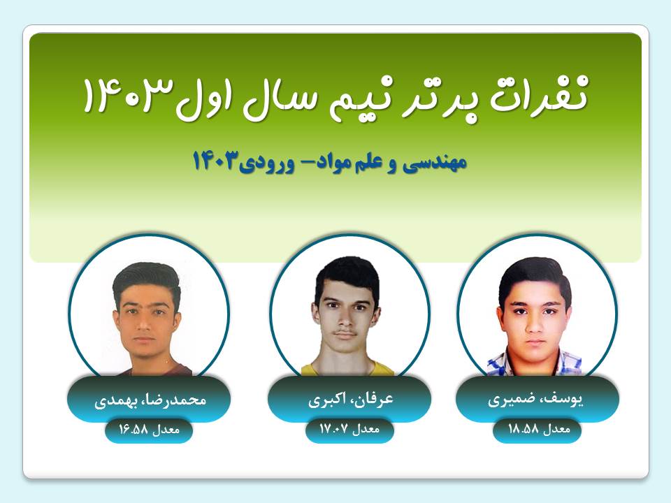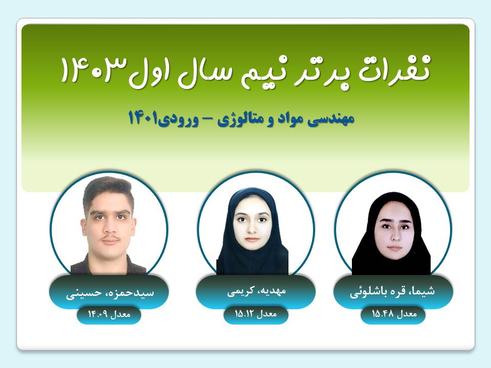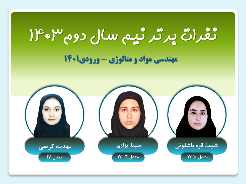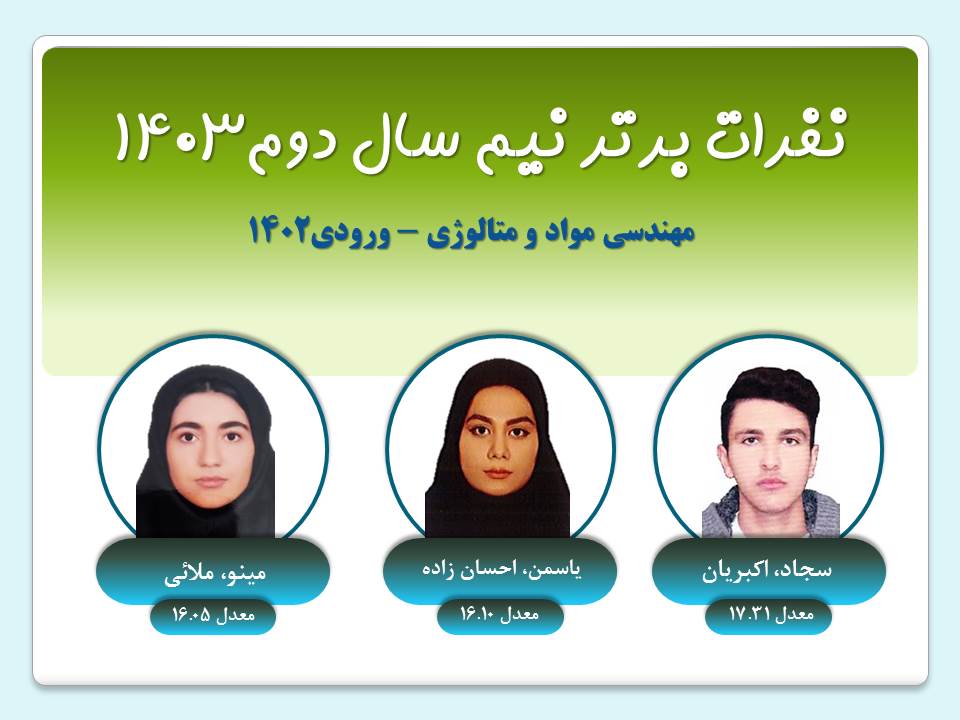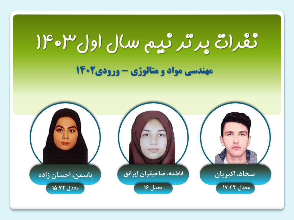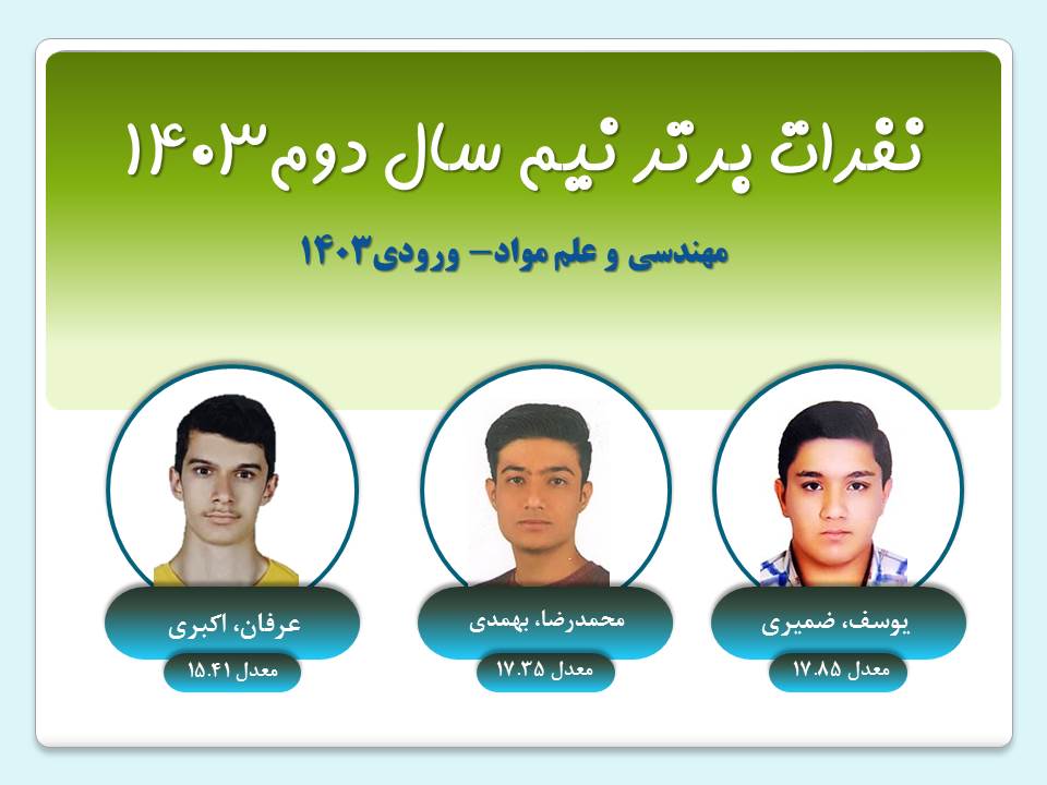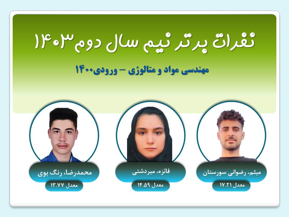 نفرات برتر هر ترم گروه مهندسي مواد نيم سال دوم 1403 ورودي1403ورودي1402ورودي1401ورودي1400 نيم سال اول 1403 ورودي1403ورودي1402ورودي1401ورودي1400 نيم سال دوم 1402 ورودي1402ورودي1401ورودي1400