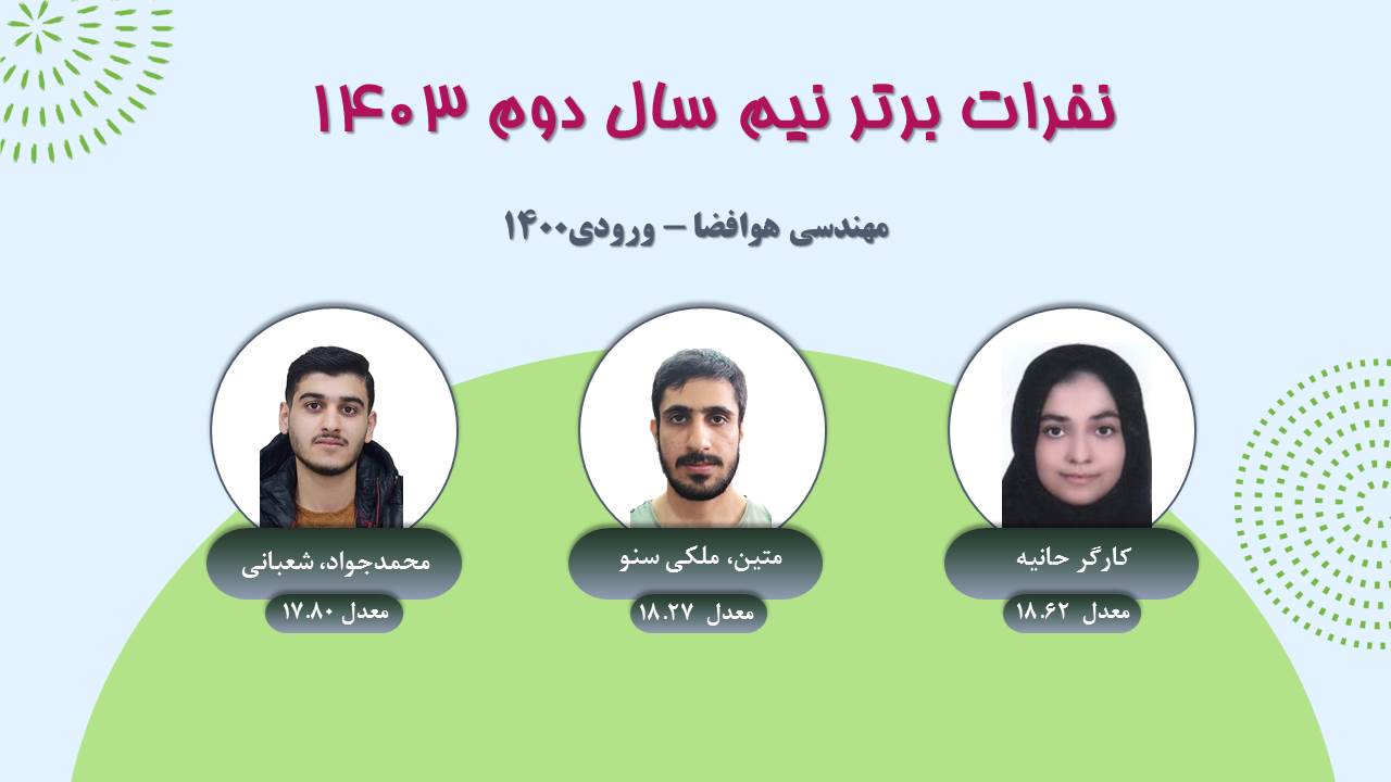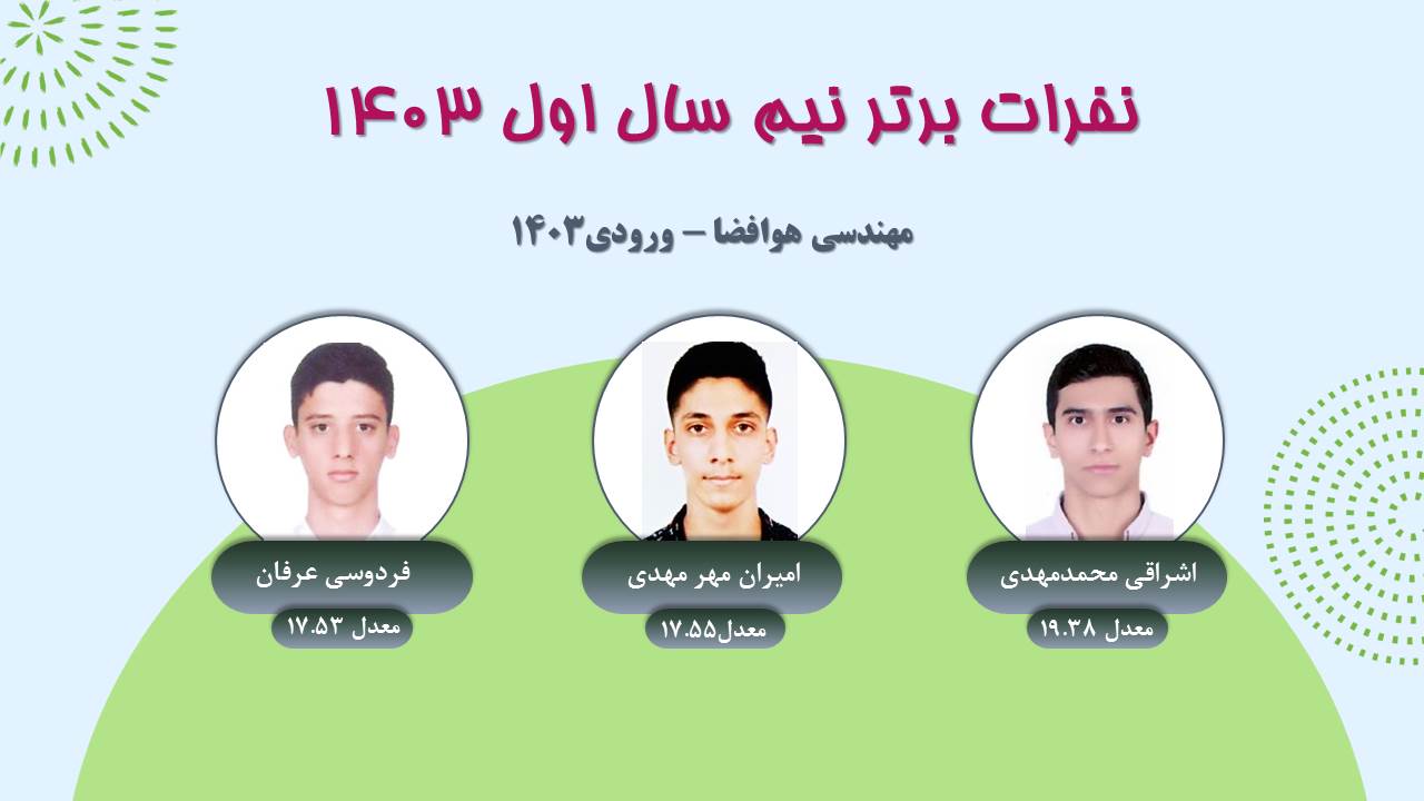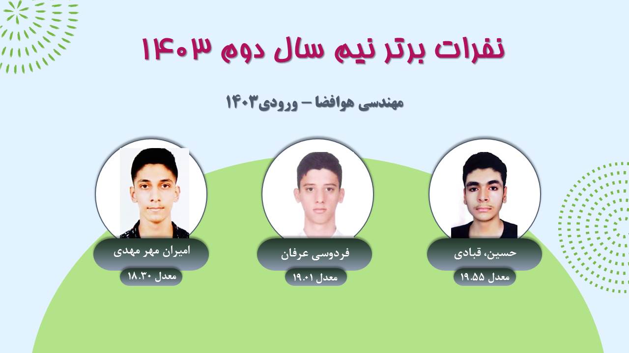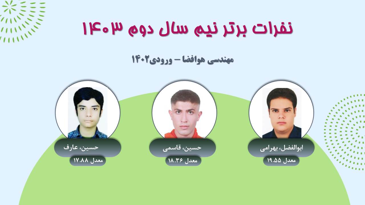 نفرات برتر گروه مهندسي هوافضا نيم سال دوم 1403 ورودي1403- هوافضاورودي1402- هوافضاورودي 1401- هوافضاورودي1400- هوافضا نيم سال اول 1403 ورودي1403- هوافضاورودي1402- هوافضاورودي 1401- هوافضاورودي1400- هوافضا نيم سال دوم 1402 ورودي1402- هوافضاورودي 1401- هوافضاورودي1400- هوافضا