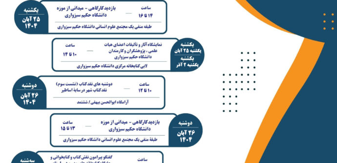 آخرین اخبار برنامه های هفته کتاب و کتابخوانی و بزرگداشت مقام والای کتابدار تاریخ۲۴ آبان ۱۴۰۴ برگزاری نخستین نشست ” دوشنبه های نقد کتاب” تاریخ۲ مهر ۱۴۰۴ آیین تکریم رئیس پیشین و معارفه رئیس جدید کتابخانه مرکزی، موزه و مرکز اسناد دانشگاه برگزار شد تاریخ۷ خرداد ۱۴۰۴ بازدید دانش آموزان از مجموعه موزه ها و مرکز اسناد دانشگاه حکیم سبزواری تاریخ۹ اردیبهشت ۱۴۰۴ همایش “روایت عاشقانه یک کتابدار” با حضور کتابداران شهرستان سبزوار تاریخ۳۰ آبان ۱۴۰۳ برنامه ی روز سه شنبه به مناسبت هفته کتاب تاریخ۲۹ آبان ۱۴۰۳