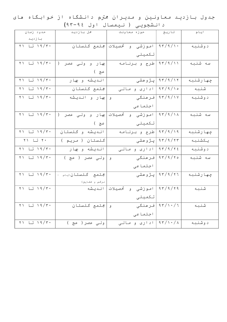 جدول بازدید معاونین و مدیران محترم دانشگاه از خوابگاه های دانشجویی ( نیمسال اول ۹۴-۹۳ )