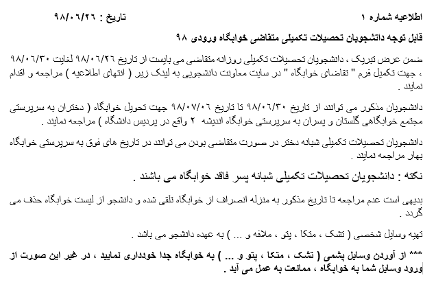 اطلاعیه در خصوص دانشجویان تحصیلات تکمیلی متقاضی خوابگاه ورودی ۹۸