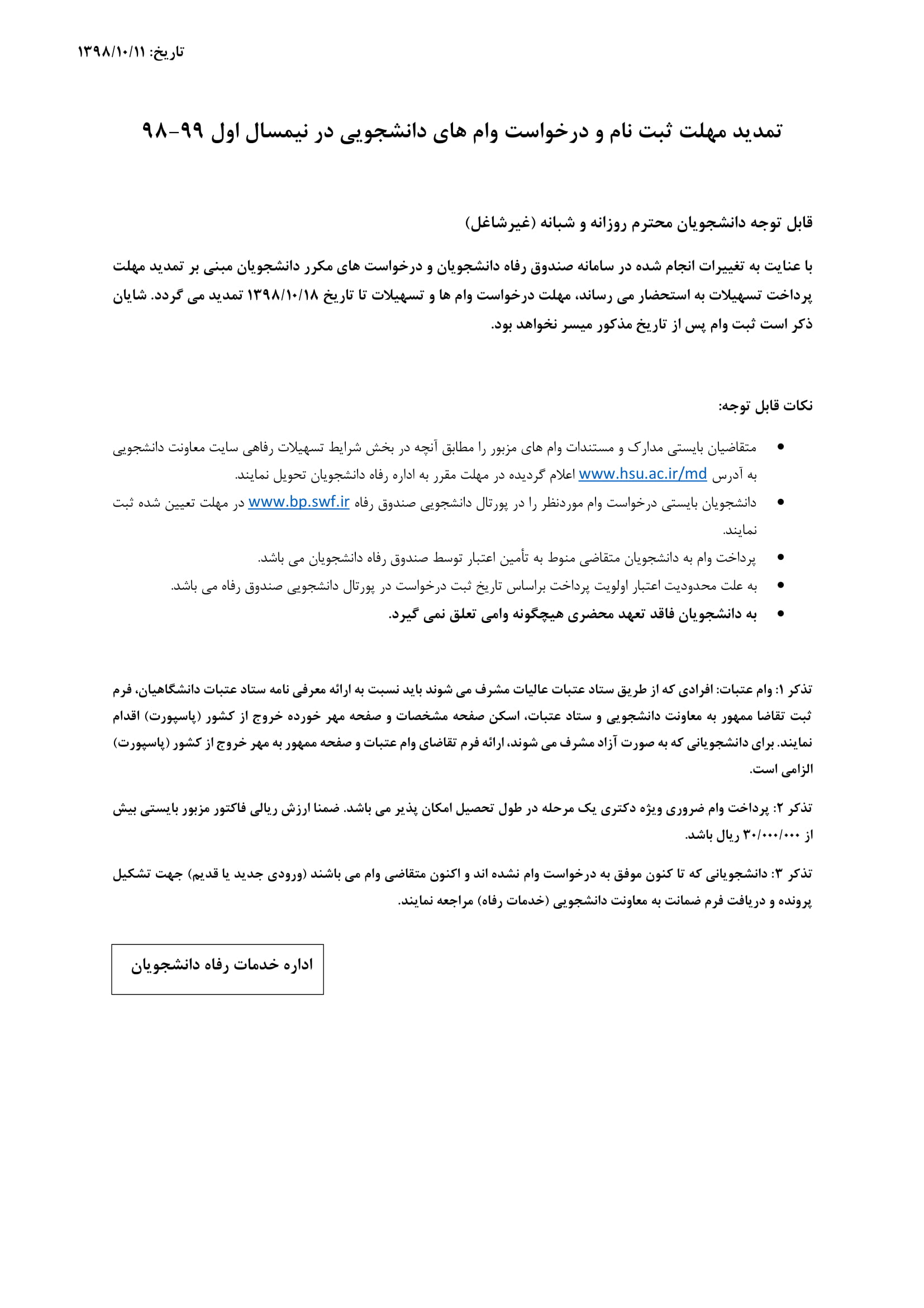 تمدید مهلت ثبت نام و درخواست وام های دانشجویی در نیمسال اول ۹۹-۹۸