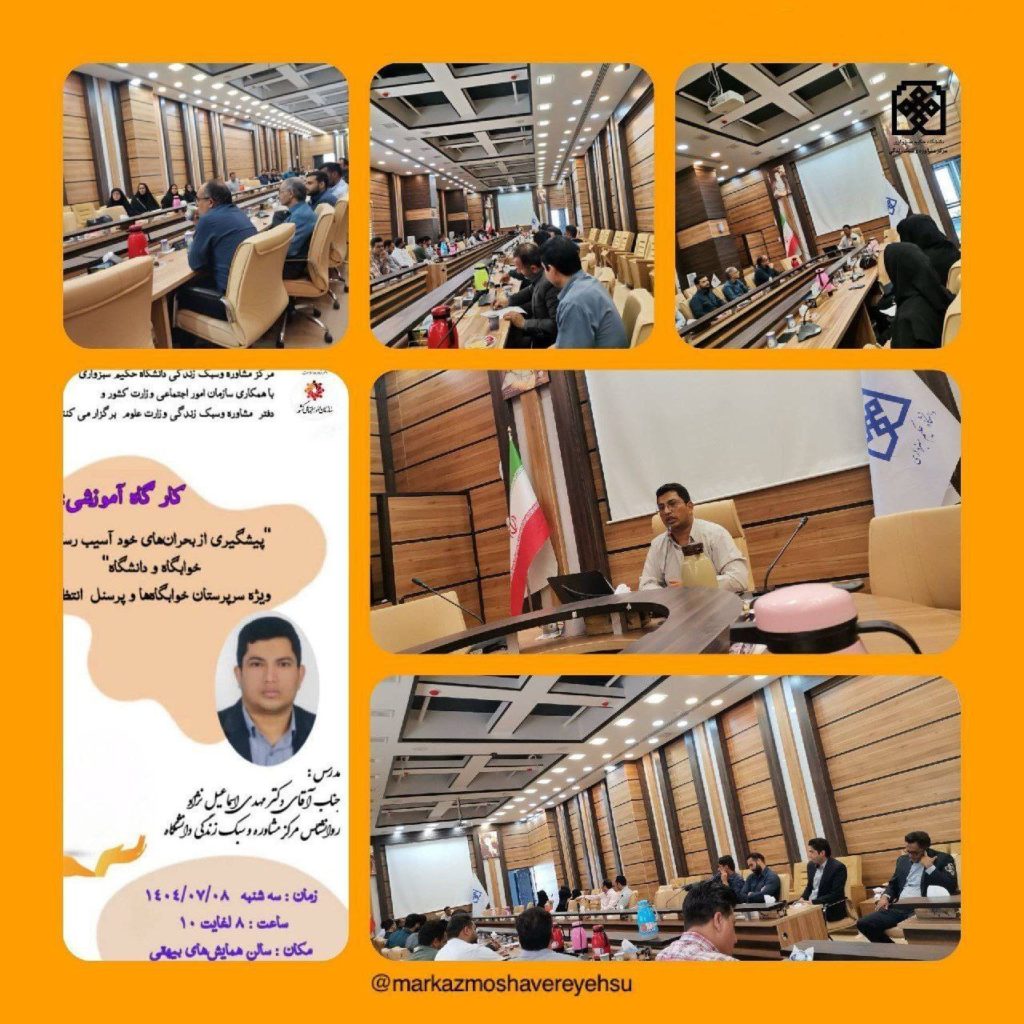 برگزاری کارگاه آموزشی ” پیشگیری از بحرانهای خود آسیب رسان در محیطهای خوابگاهی و دانشگاه” ویژه سرپرستان خوابگاهها و پرسنل انتظامات توسط مرکز مشاوره و سبک زندگی دانشگاه حکیم سبزواری
