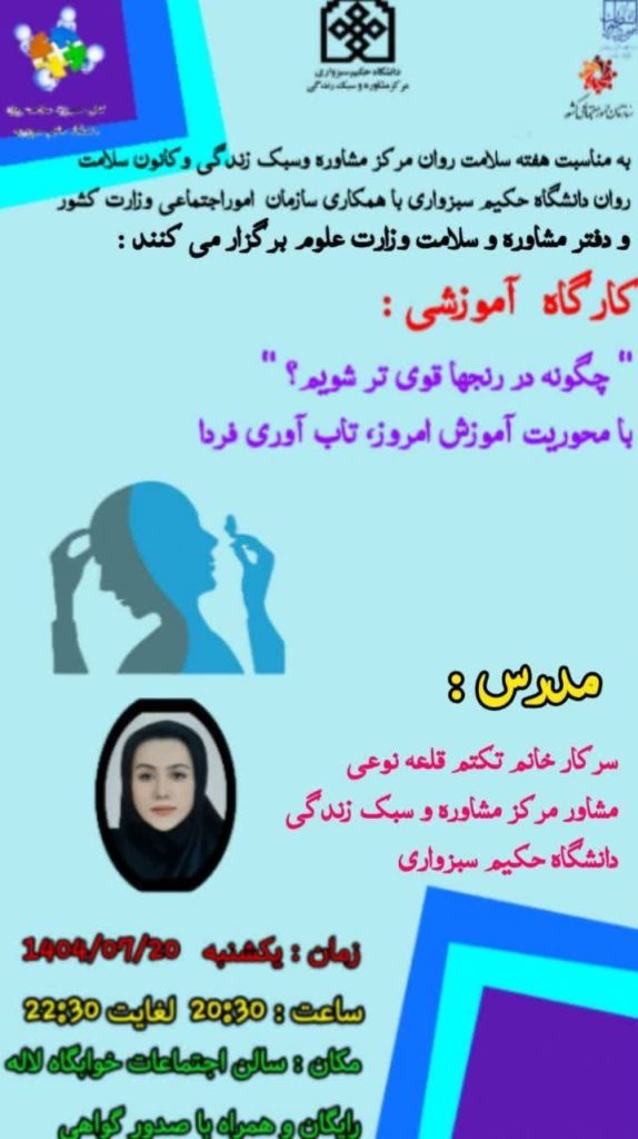 به مناسبت هفته سلامت روان، مرکز مشاوره و سبک زندگی وکانون سلامت روان دانشگاه حکیم سبزواری با همکاری سازمان امور اجتماعی کشور و دفتر مشاوره و سلامت وزارت علوم برگزار می کنند :