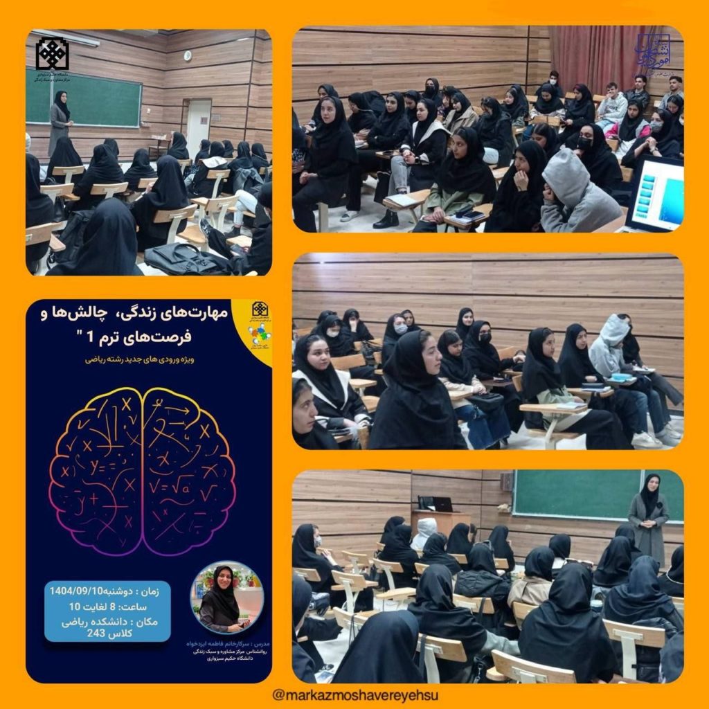 1- کارگاه آموزشی “مهارتهای زندگی” ویژه نوورودهای رشته ریاضی با حضور خانم ایزدخواه روانشناس مرکز مشاوره و سبک زندگی دانشگاه در روز دوشنبه 1404/09/10.