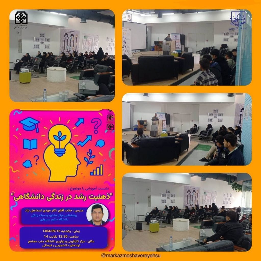 گزارش تصویری برگزاری نشست آموزشی “ذهنیت رشد در زندگی دانشگاهی” به مناسبت روز دانشجو توسط مرکز مشاوره و سبک زندگی با همکاری مرکز کارآفرینی و نوآوری دانشگاه حکیم سبزواری