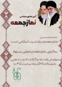 سرویس رفت و برگشت ،جمعه از درب جنوب دانشگاه برای اقامه نماز جمعه حرکت خواهد کرد. 🕙ساعت ۱۰:۴۵ 📆جمعه ۲۸ آذر ماه 🕌 مصلی سبزوار