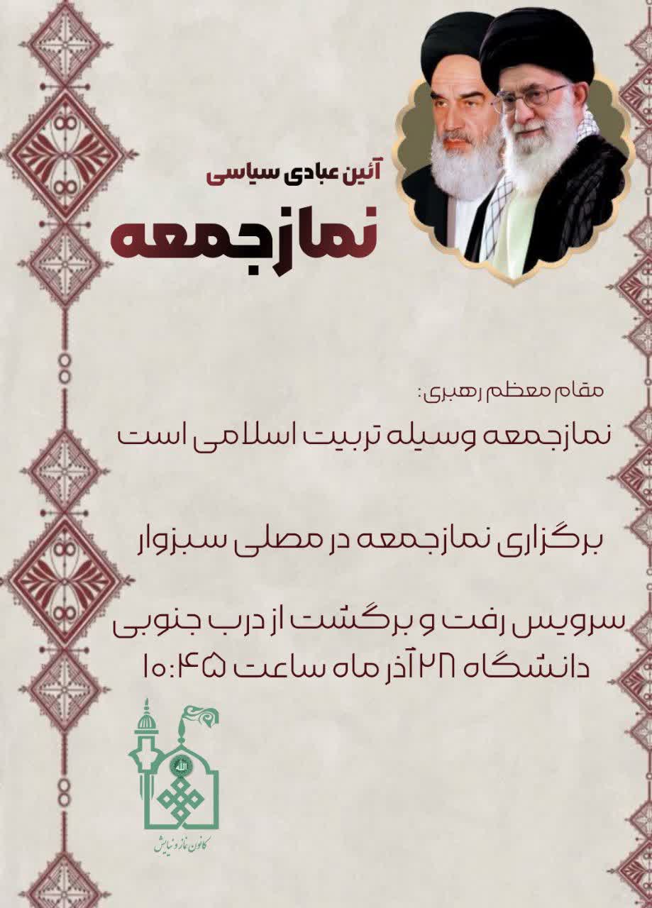 سرویس رفت و برگشت ،جمعه از درب جنوب دانشگاه برای اقامه نماز جمعه حرکت خواهد کرد.