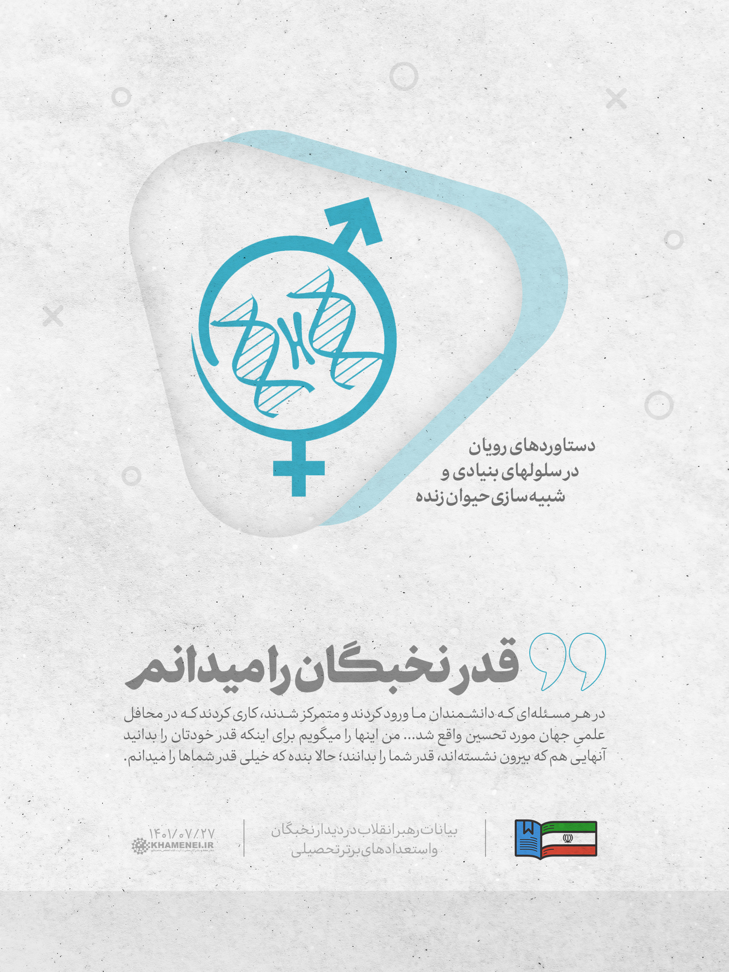 حضرت آیتالله خامنهای: «در هر مسئلهای که دانشمندان ما ورود کردند و متمرکز شدند، کاری کردند که در محافل علمیِ جهان مورد تحسین واقع شد… من اینها را میگویم برای اینکه شما که نخبهاید، قدر خودتان را بدانید، آنهایی هم که بیرون نشستهاند، قدر شما را بدانند؛ حالا بنده که خیلی قدر شماها را میدانم.» ۱۴۰۱/۷/۲۷