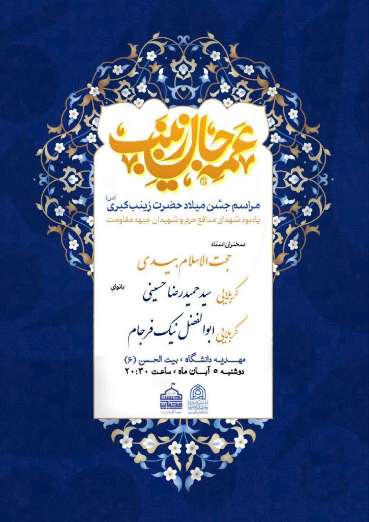 مراســــــم هیأت هفتگی به مناسبت جشن میلاد حضرت زینب کبری (س) و یادبود شهدای مدافع حرم و شهیدان جبهه مقاومت آبان ۵, ۱۴۰۴ ادامه مطلب »