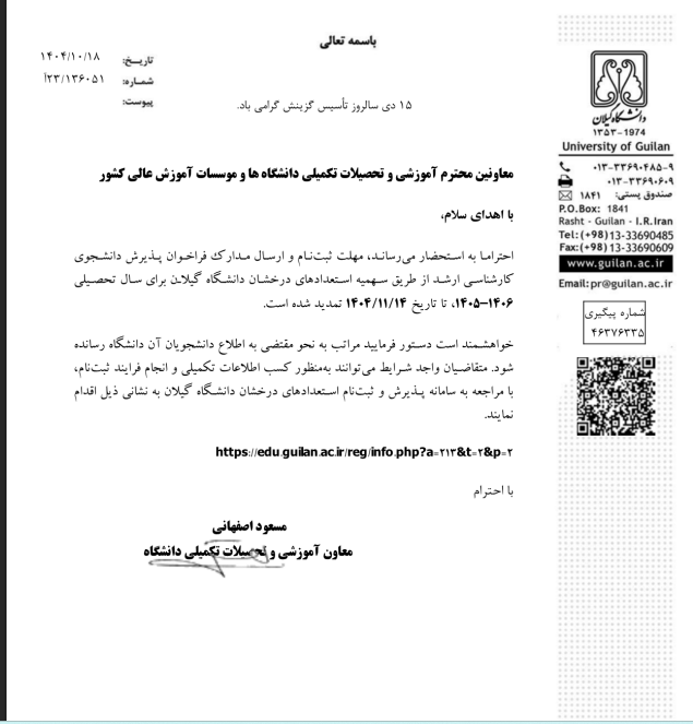 فراخوان پذیرش دانشجو از طریق استعداد درخشان مقطع کارشناسی ارشد دانشگاه گیلان برای سال تحصیلی ۱۴۰۶-۱۴۰۵