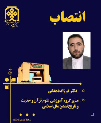 با حکم رئیس دانشگاه، دکتر فرزاد دهقانی به عنوان مدیر گروه آموزشی علوم قرآن و حدیث و تاریخ تمدن ملل اسلامی منصوب شد.